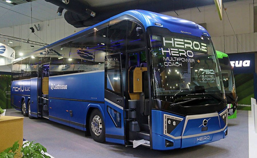Іспанський виробник автобусів Castrosua показав свого «Героя». Hero – великий триосний електробус, зібраний на платформі Volvo BZR Electric. Максимально можлива ємність акумулятора для цього шасі становить 720 кВт·год. Він складається з 8 блоків АКБ, кожен із яких має ємність 90 кВт·год і важить 535 кг. Таким чином формується електробус із дальністю ходу в 700 км. Щоправда, загальна маса батарей сягає 4280 кг.
