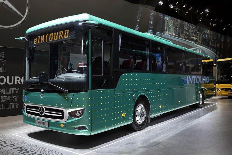 На виставці відбулася світова прем’єра і Mercedes-Benz eIntouro – першого електричного міжміського автобуса компанії Daimler Buses. Серійний зразок був створений на базі дизельної моделі Intouro. Електробус доступний у двох довжинах – 12,18 і 13,09 м, розрахований на 50–63 пасажирів і оснащується одним чи двома акумуляторними блоками NMC4 нового покоління із загальною ємністю до 414 кВт·год. Це забезпечує запас ходу до 500 км. Зарядка через порт CCS Type 2 можлива потужністю до 400 кВт. У приводі застосований центральний електромотор номінальною потужністю 320 кВт (400 кВт – пікова). У списку систем безпеки – Active Brake Assist 6, Sideguard Assist 2, Frontguard Assist, Traffic Sign Assist, Attention Assist та опціональні MirrorCam або камера 360°. Перші поставки клієнтам заплановані на другу половину 2026 року.